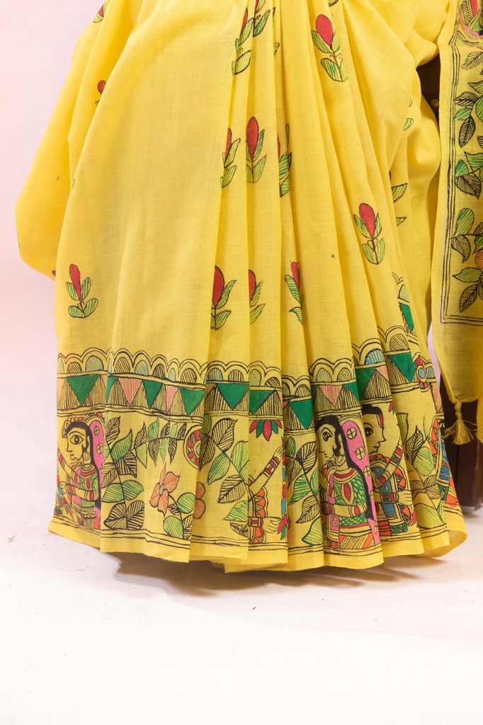 Yellow Ram Sita Vivaah hand painted Madhubani cotton saree
